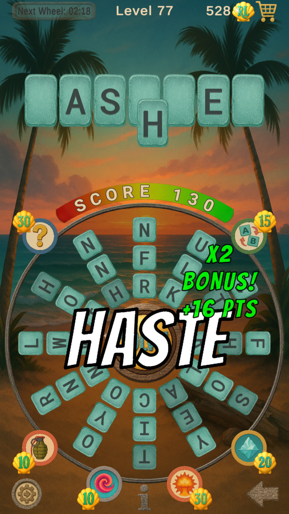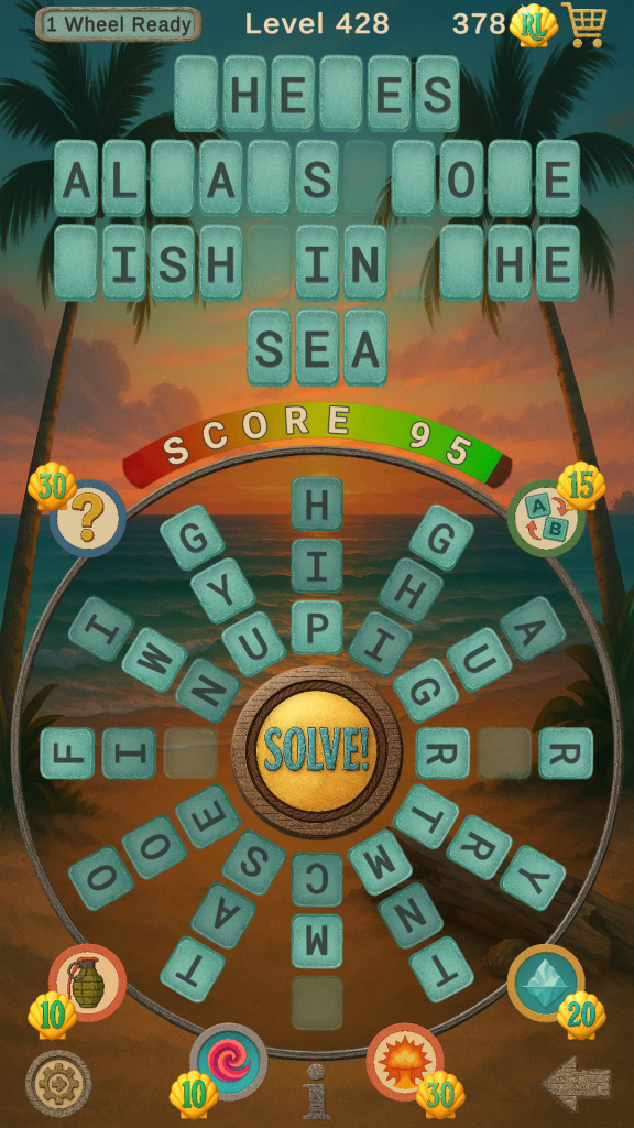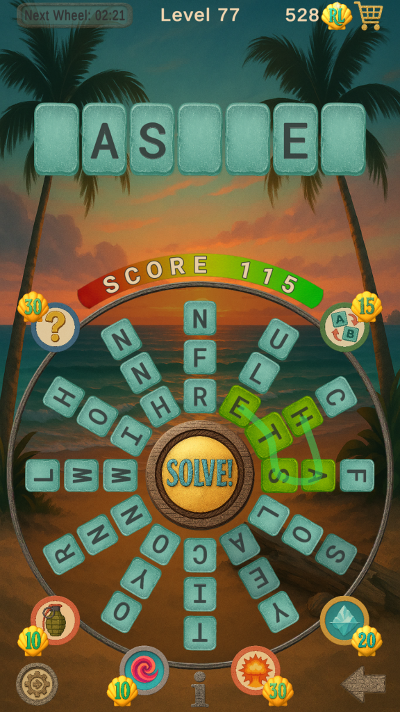 Every word you make can reveal matching letters in the Target Word. Power-Ups can swing the game your way. When you’re ready, tap SOLVE, type the missing letters, and submit. If the timer expires, you’ll replay the level with a new target word for another attempt.