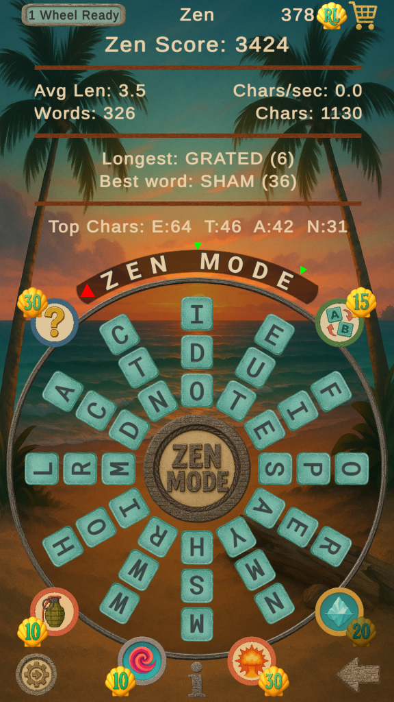 - Solo Play Modes – Play Mode (timed with Target Word) and Zen Mode (untimed, endless play).